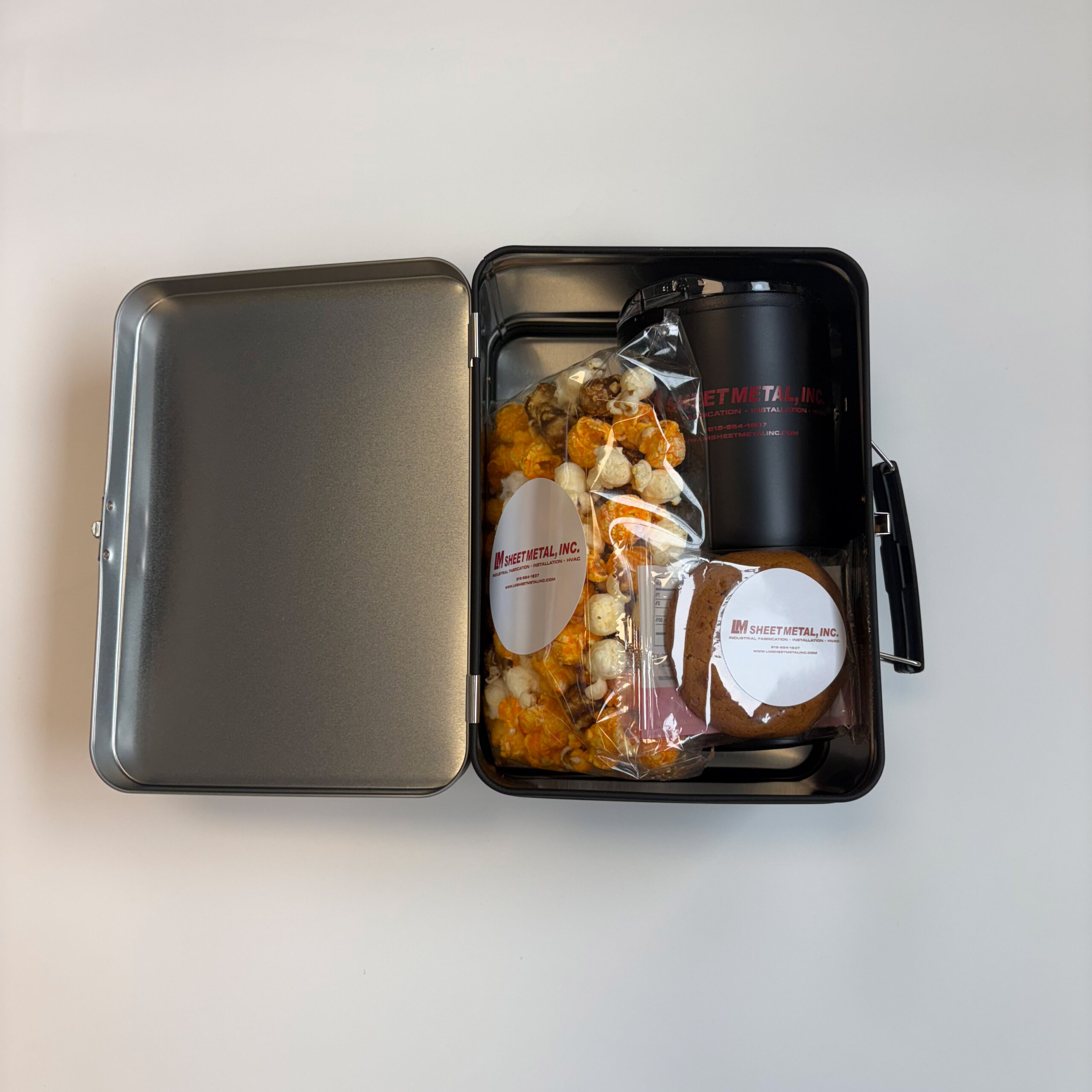 We created these awesome and unique kits for LM Sheet Metal! Starting with a custom metal lunchbox, we filled these kits with custom popcorn, cookies, and a tumbler.